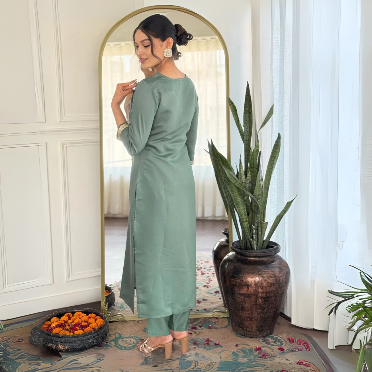 Crafted from premium quality fabric, this suit set offers superior comfort and a flattering fit. Whether made from soft cotton, luxurious silk, or lightweight chiffon, the material ensures breathability and ease of movement, making it ideal for all-day wear.