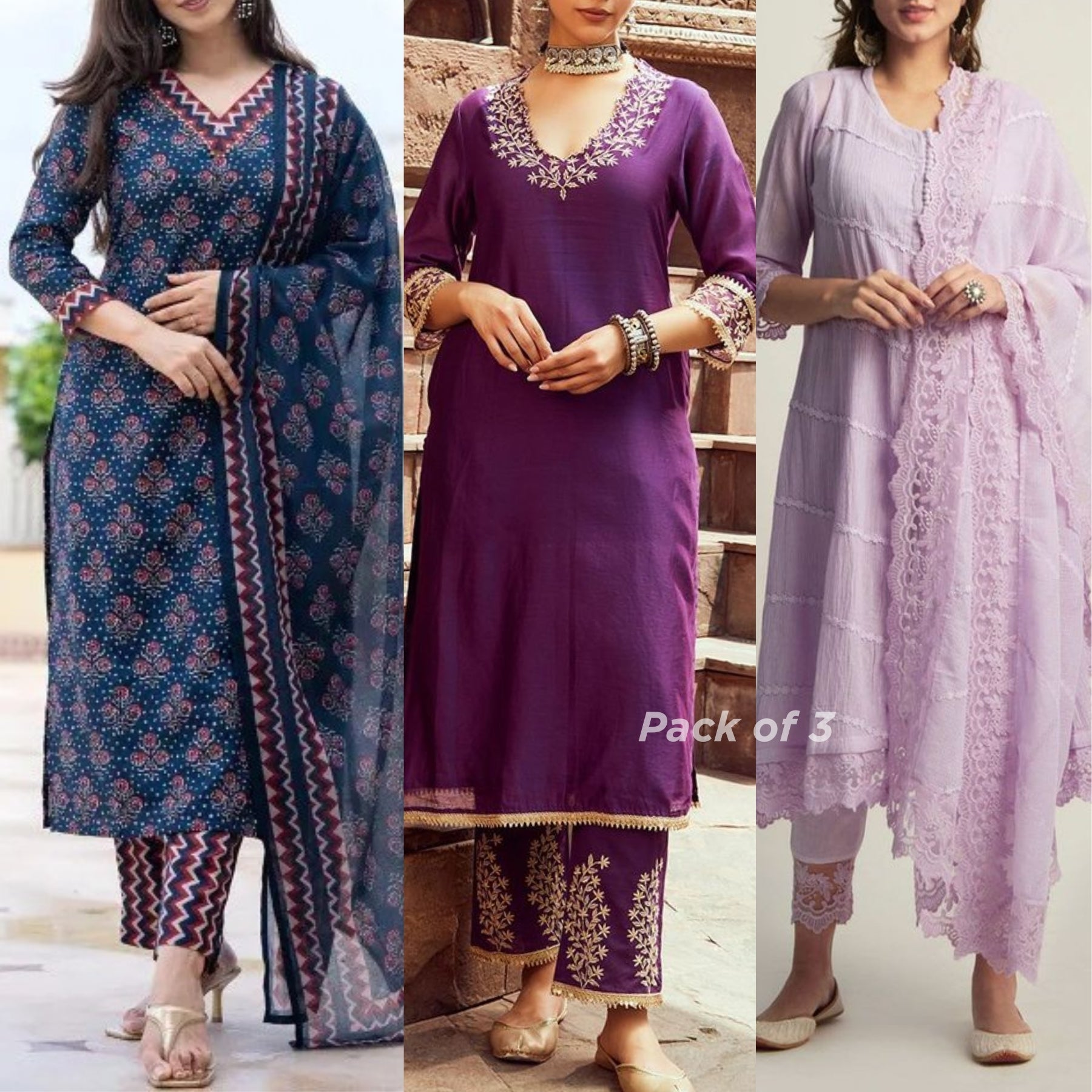 Elegant 3-Piece Women Kurti Set with Dupatta Combo Pack – Stylish, Comfortable & Versatile Ethnic Wear | KS-09